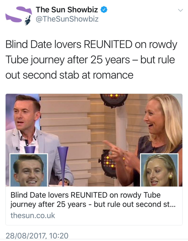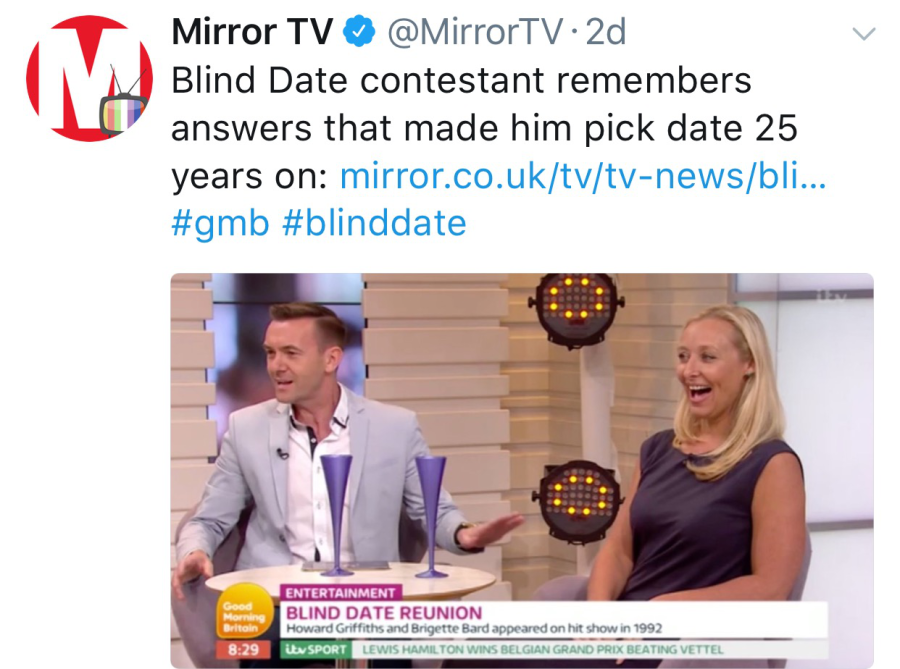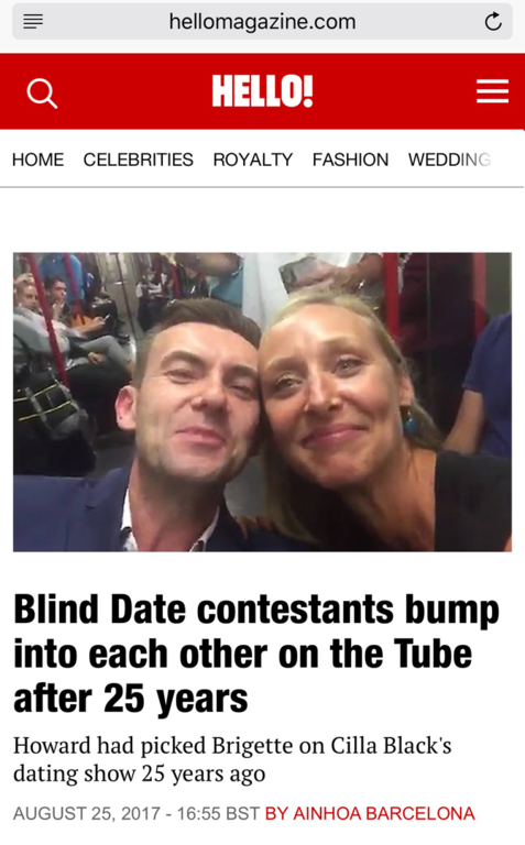 24th August - Howard's video Tweet of reunion on London Tube with the woman he picked on ITV Blind Date 25 years ago goes viral & within hours is a top News Story Online, On Radio, On National TV, in National Newspapers & National Magazines. TV appearances included ITV Evening News studio guest 25/8/17 & ITV Good Morning Britain studio guest 28th August 2017. Multimedia coverage of ITV GMB appearance below.